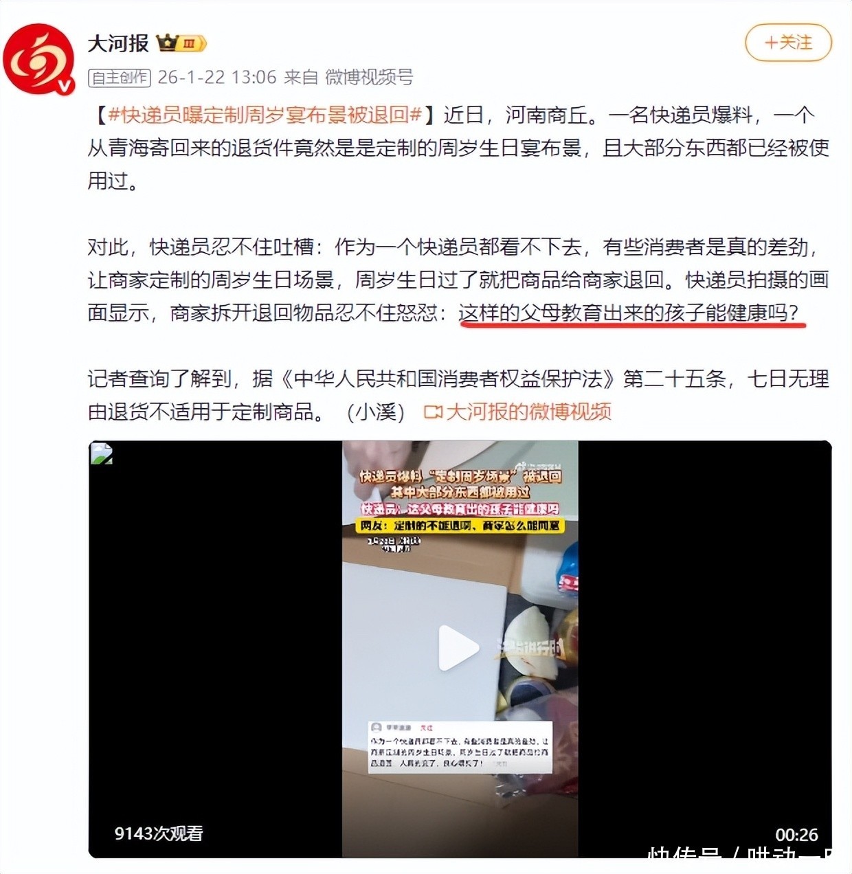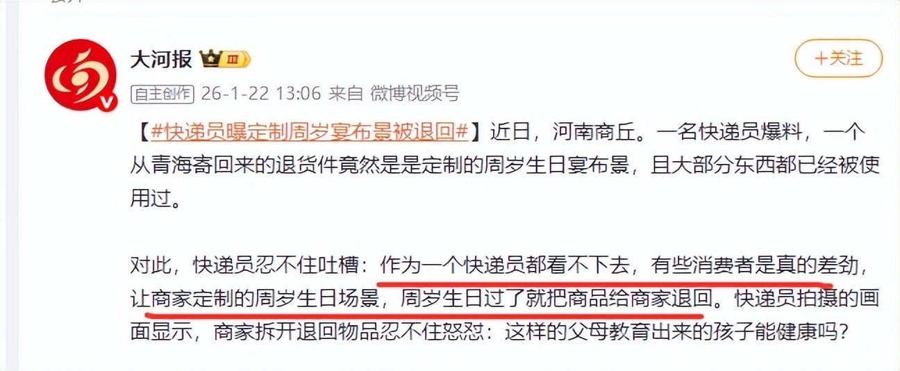 1月22日,一场对于说念德底线的辩论席卷各大酬酢平台。缘故是一件令东说念认识目结舌的退货事件——一双父母在为孩子办完周岁宴后,竟将整套定制打法说念具保残守缺地寄回商家。