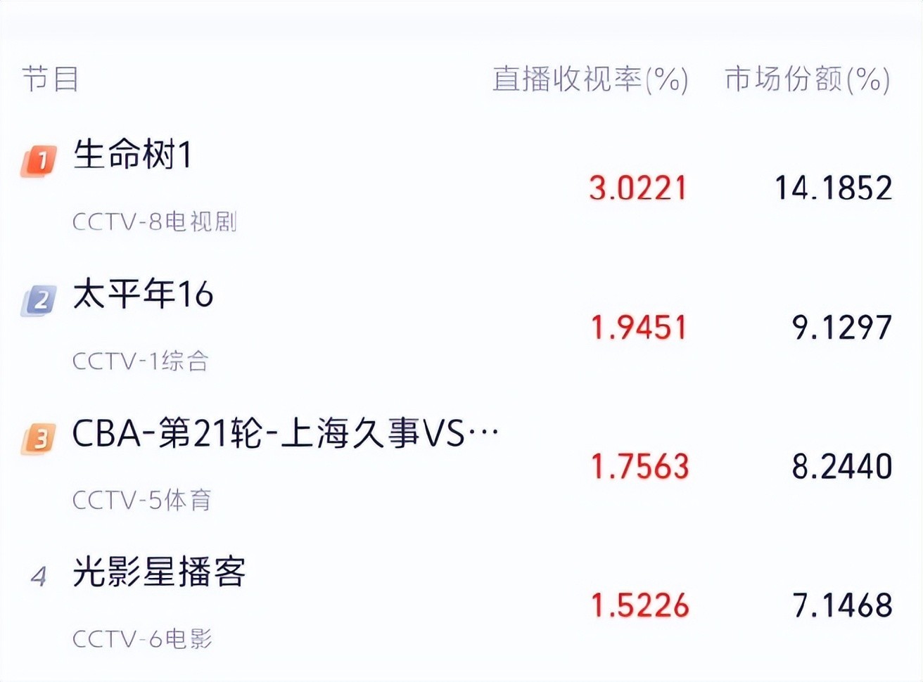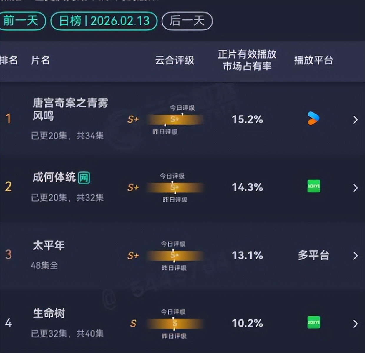 从云合数据榜单上看,《唐宫奇案》的正片有用播放市集占有率最高,依然达到15.2%,紧随自后的是《成何体统》14.3%,而《生命树》径直下落到第四位,也即是说,《生命树》从开播到当今,就莫得登顶云合数据榜单。